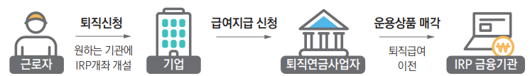 2. 근로자는 퇴사 전에 퇴직금을 받기 원하는 금융기관에 IRP계좌를 만들어 놓습니다.